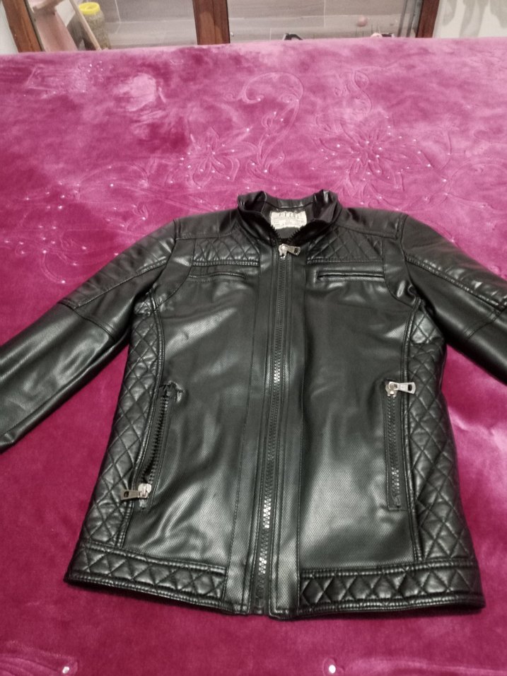 Siyah deri biker ceket, fermuarlı ön ve cepler, kesik yakalı, uzun kollu. Yanlarda ve etekte kapitone detaylı, normal kesim. Sokak stili ve günlük kullanım için uygun.
