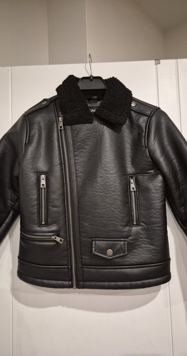 Siyah deri ve kürk detaylı, yakası kesik biker ceket. Dar kesim, askılı kollu, normal midi boyda, fermuarlı ve çıtçıtlı cep detaylı.