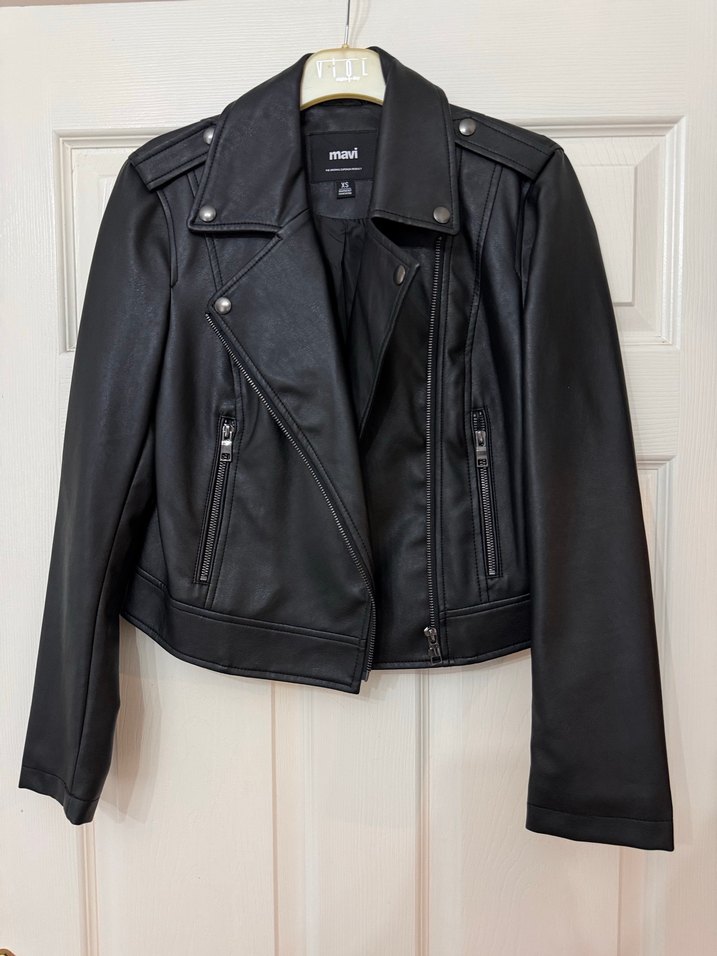Siyah deri ceket, kesik yakalı ve tokalı detaylara sahiptir. Normal uzunlukta, düzenli kesim ve ofis için uygundur. Minimalist tarzda, uzun kolludur. mavi markalıdır hıc gıyılmedı xs bedendır