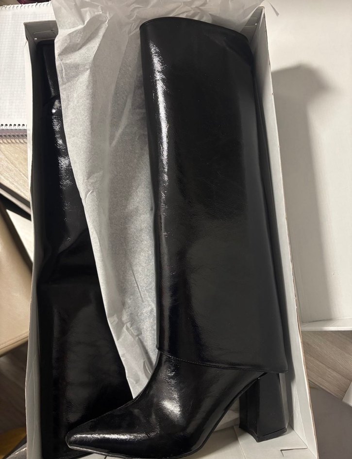 Siyah deri, tokalı, blok topuklu dizüstü kadın çizme, günlük kullanıma uygun modern ve şık tasarım.Hiç kullanılmadı.