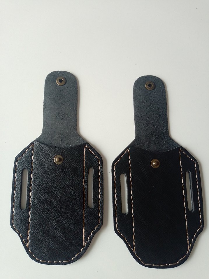 Dikişli kenarları ve çıtçıt kapakları olan siyah deri bıçak kılıfı seti. Güvenli taşıma için uygundur.