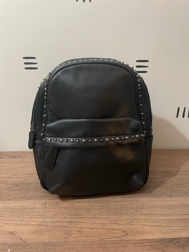 Metal çıtçıt detaylı siyah deri sırt çantası, rock punk tarzını yansıtıyor. Ön cepli ve günlük kullanıma uygun, desensiz koyu renkte.