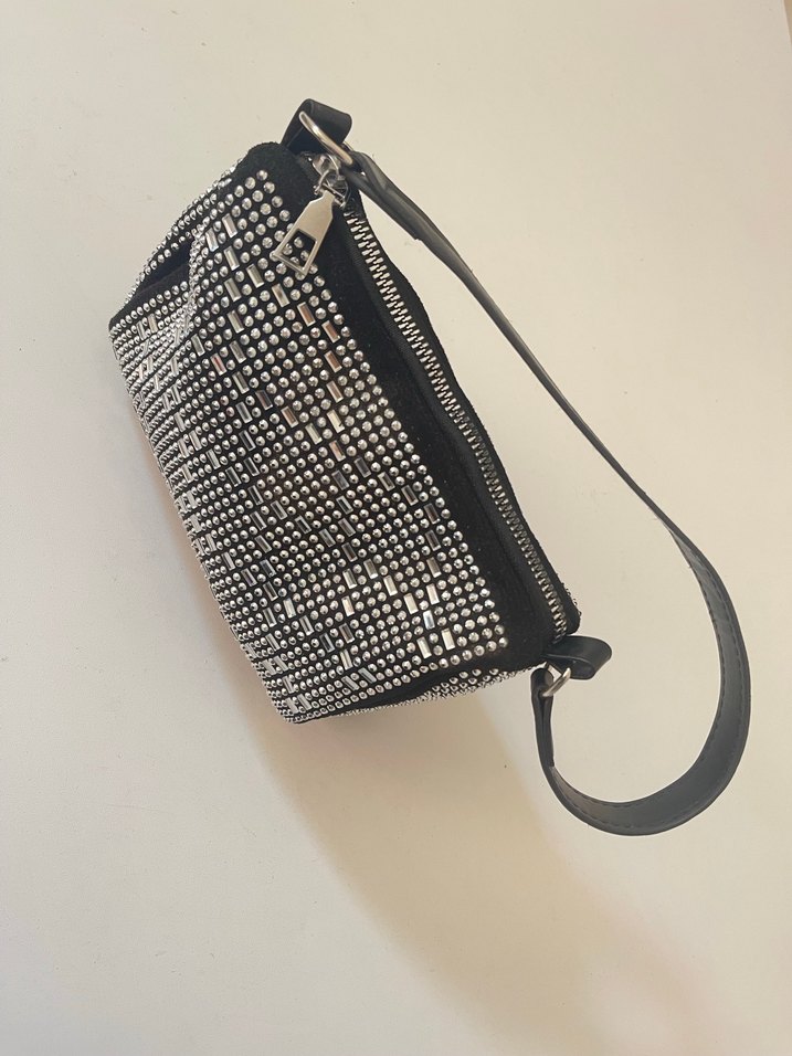 Siyah deri, çivili detaylara sahip, kemerli ve yılan desenli rock punk tarzında kadın çantası.
