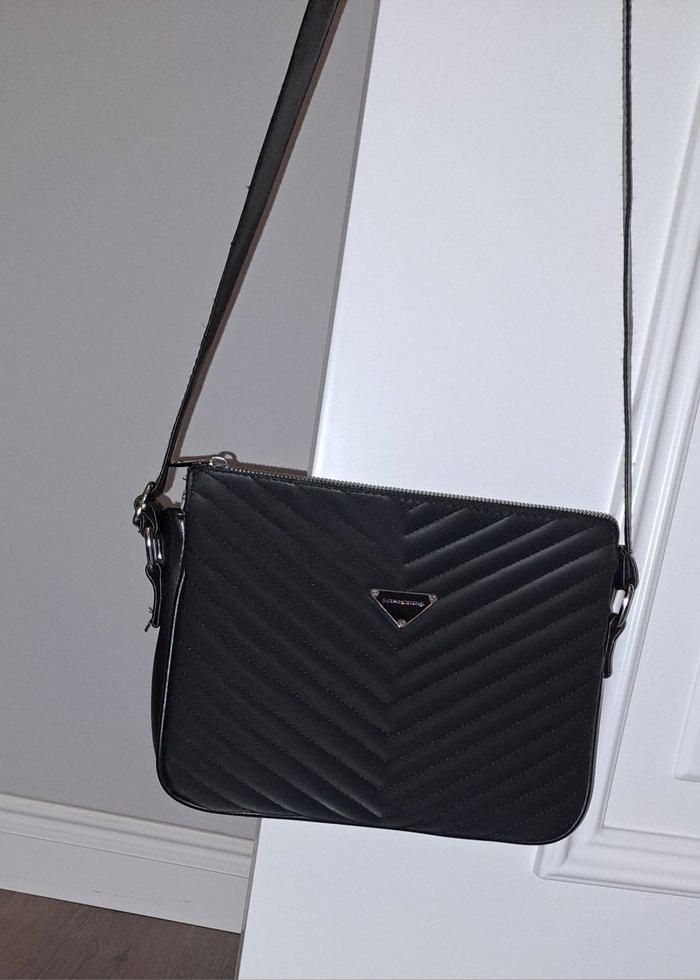 Siyah deri ve çizgili desene sahip kadın çantası, fermuarlı kapanışıyla günlük sokak stiline uygundur. Sayılı kullanılmıştır.Hiç bir sorunu yoktur.Boy 20 cm.en 25 cm.