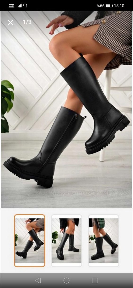 Son fotoğraflarda kusurlarını belirttim arka alt kısmı çok belli olmuyor Siyah deri botlar, kalın topuklu. Günlük kullanım için uygundur, çok az kullandım