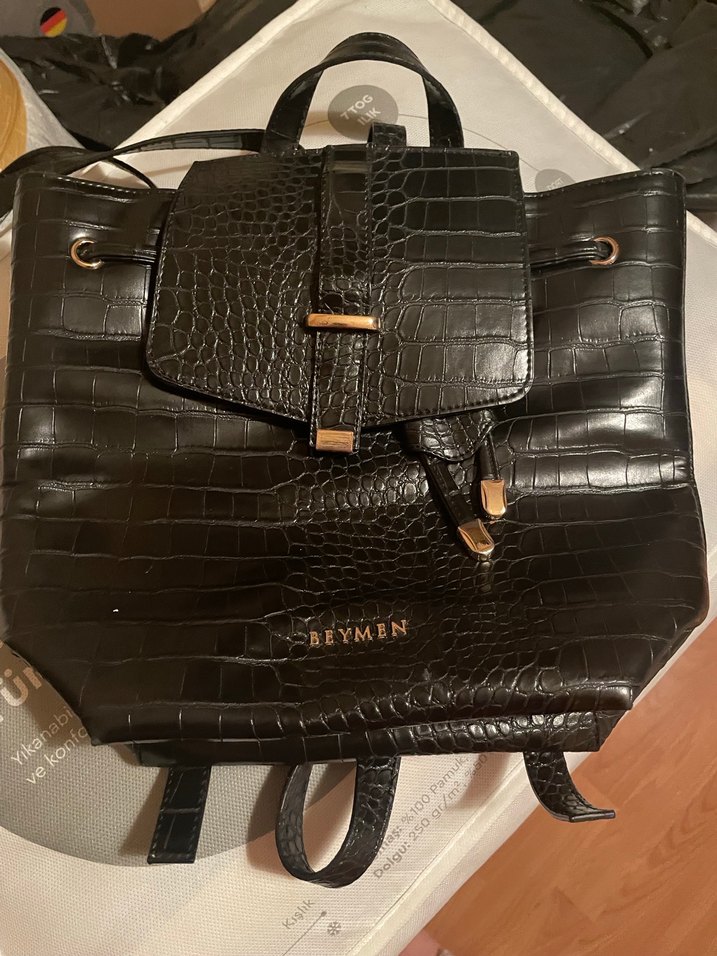 Siyah deri croco desenli, tokalı kapaklı kadın sırt çantası, günlük kullanıma uygun trend sokak stiliyle.