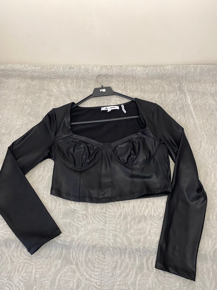 , uzun kollu, siyah deri mini bluz, tek renk ve gotik tarzda, vücuda oturan kesime sahiptir. Hiçbir deformesi yoktur.