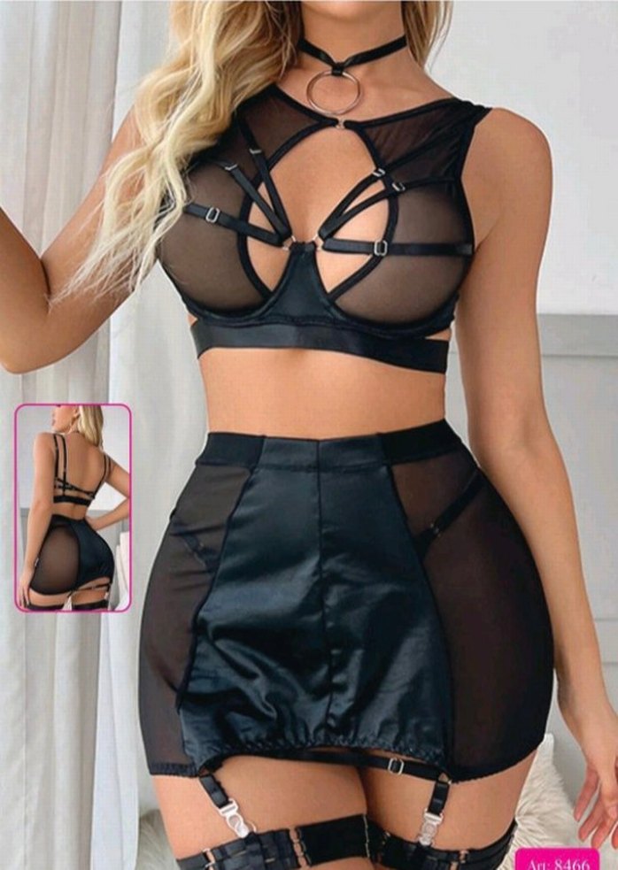 Siyah deri ve dantel detaylı, askısız yaka ve kayışlı tasarıma sahip, vücuda oturan kısa uzunlukta gotik mini gecelik takim. Bedenleri mevcuttur