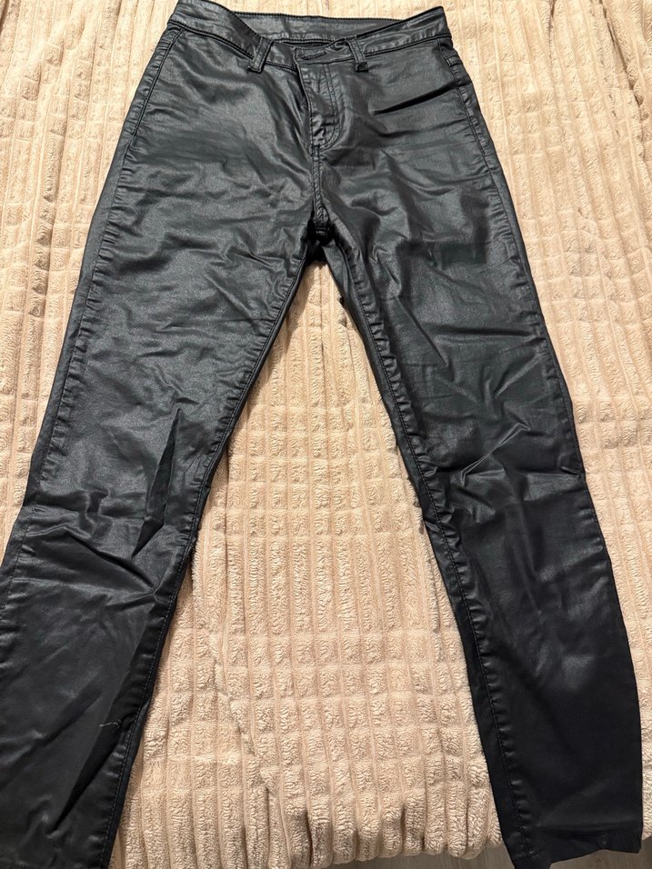 Kemerli, midi boy, siyah deri dar kesim kadın pantolon. Günlük sokak stili için uygun, düz ve şık görünüm sağlar. Hiç bir sorunu yoktur marka temsili
