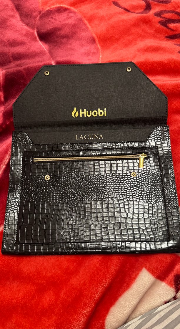 Siyah deri, desenli ve fermuarlı cepli kadın portföy çanta. Klasik ve gotik tarzda, romantik akşamlar için uygun. Üzerinde 'LACUNA' ve 'Huobi' yazılı.
