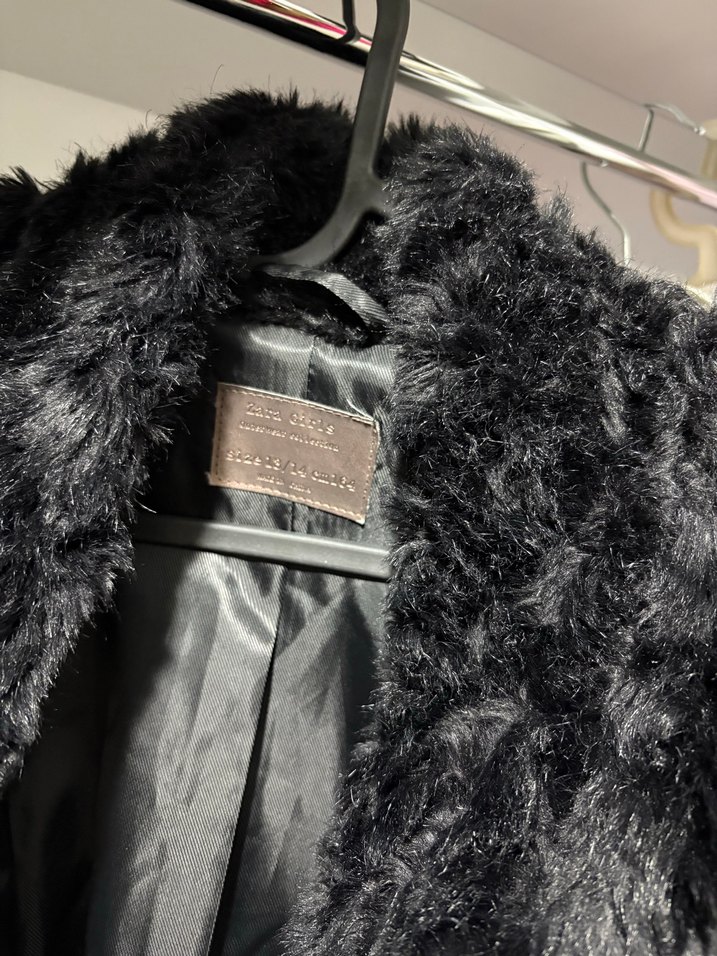 Siyah deri detaylı, kürk işlemeli kadın montu, askılı kolları ve kesik yaka ile gotik tarzı yansıtır. Orta boy, baskılı ve günlük kullanıma uygundur.