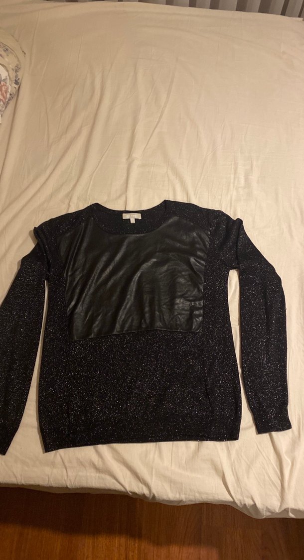 Deri ön panel ve örgü dokusuna sahip, uzun kollu, bisiklet yaka, siyah dar kesim kadın triko. Günlük kullanıma uygun, trend sokak stili.