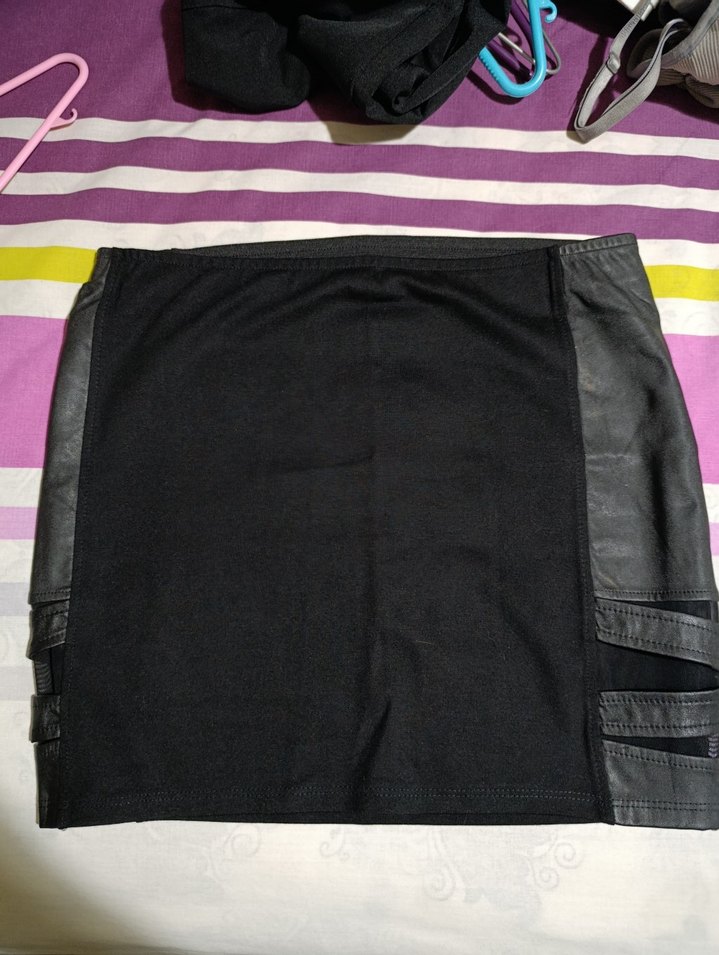 Siyah renkte, deri görünümlü yan paneller fit kesim sentetik kumaştan mini etek. Günlük sokak stili için uygundur.