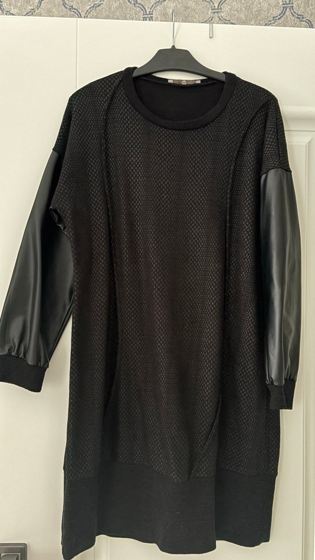 Siyah deri detaylı, uzun kollu ve gevşek kesimli tunik. Yuvarlak yaka ve örgü dokusu ile günlük kullanıma uygun goth athleisure tarzında.