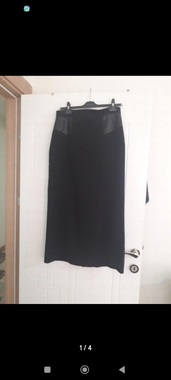 Ofis kullanımı için uygun, siyah deri detaylı uzun etek. Düz ve goth tarzında, rahat kesime sahip. kapalı yırtmacli. düz kesim