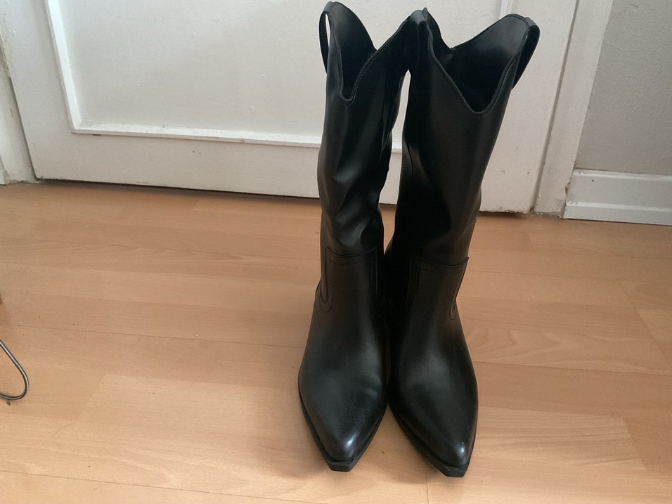 Siyah deri, diz boyu, stiletto topuklu ve tokalı detaylara sahip, desensiz günlük kullanıma uygun botlar.