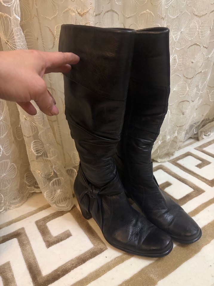 deri diz üstü botlar, yüksek topuklu ve tokalı detaylara sahip, gotik ve bohem tarzda desenlidir. Deridir çok az giyildi