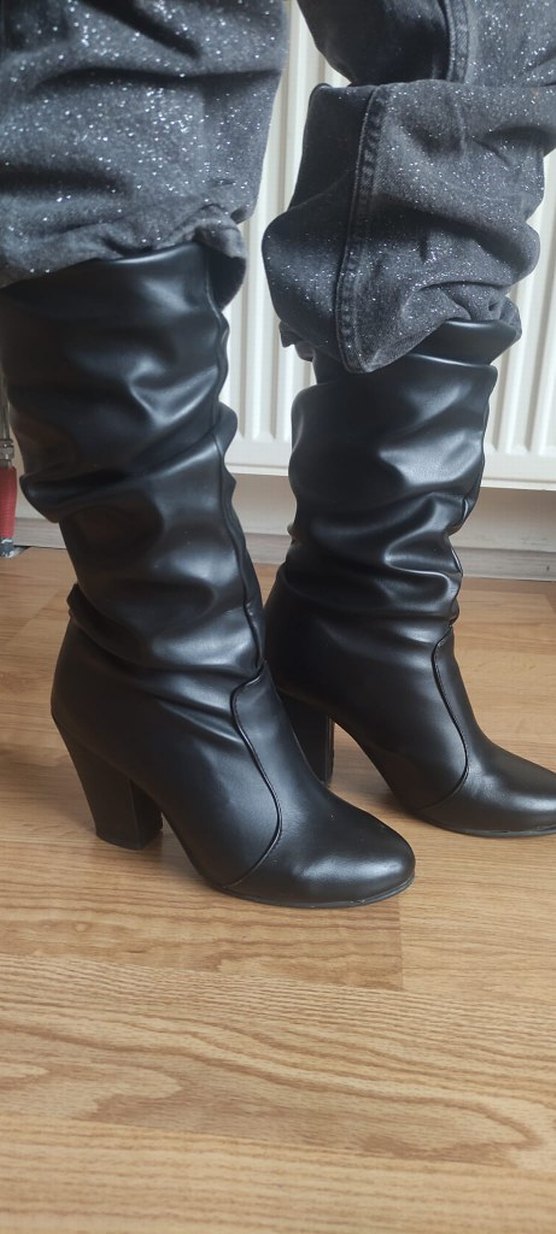 Siyah deri diz üstü pliseli topuklu botlar, cesur gotik stile uygun. Günlük kullanım için idealdir.