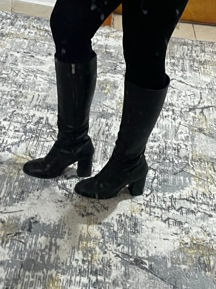 Siyah deri diz üstü çizme, ince topuklu ve tokalı detaya sahip. Minimalist gotik tarzda, günlük kullanıma uygun. Topuğu 8 10 cm dir