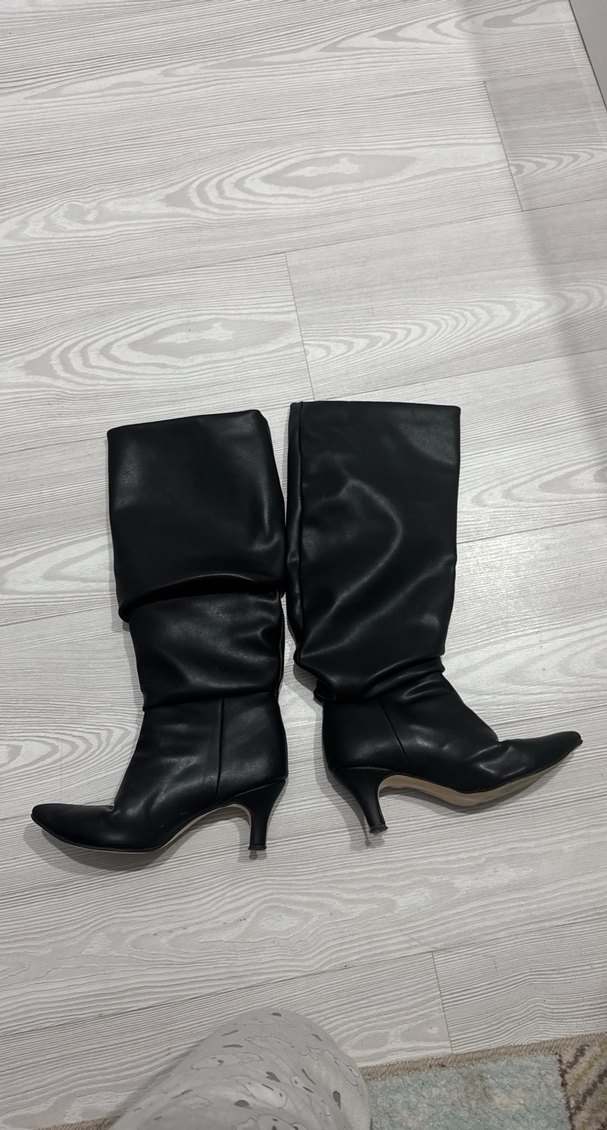 Siyah deri dizaltı topuklu kadın çizme, cesur gotik tarzıyla ofis kullanımı için uygundur. 36 numara
