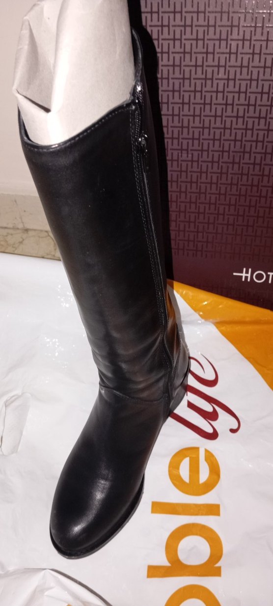 Siyah deri dizüstü botlar, ince topuklu ve yan fermuarlı. Sokak modasına uygun biker tarzında, günlük kullanıma uygun.