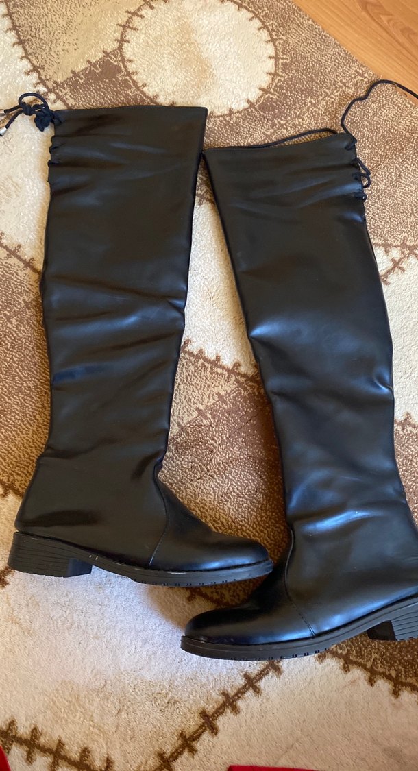 Siyah deri ve kama topuklu dizüstü kadın çizmesi. Parlak yüzeyi ve gotik tarzıyla rahat ve şık bir seçimdir. 37 numara az giydim isteyene detaylı resim gönderirim.
