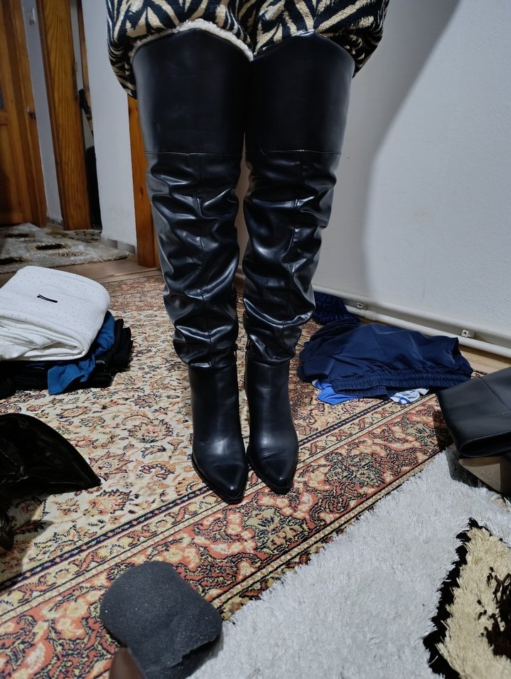 Siyah deri dizüstü stiletto topuklu, tokalı ve hafif yılan deseni dokulu bot. Günlük kullanıma uygun cesur gotik tarz.