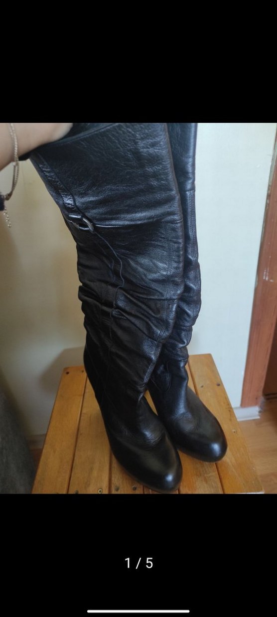 Siyah deri dizüstü stiletto topuklu bot, tokalı detaylarla gotik tarzda. boy 36 cm en 17 cm