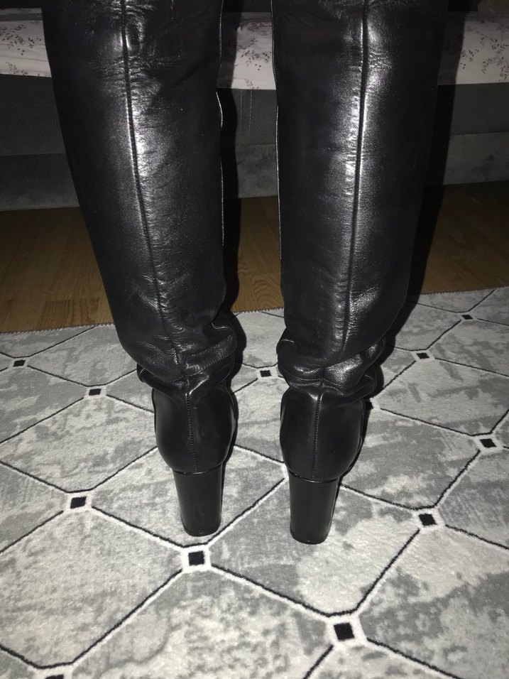 Siyah deri dizüstü botlar, stiletto topuklu ve tokalı detaylara sahip. Koyu gotik tarzda, romantik akşamlar için uygun.