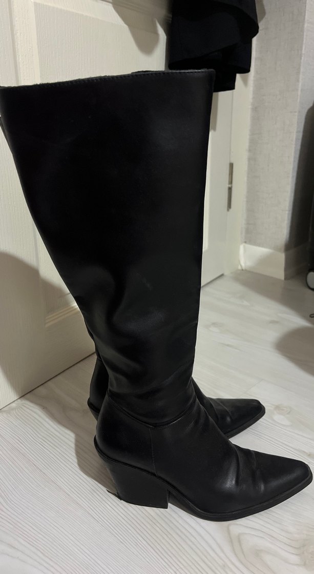 Siyah Deri Dizüstü Stiletto Topuklu Bot