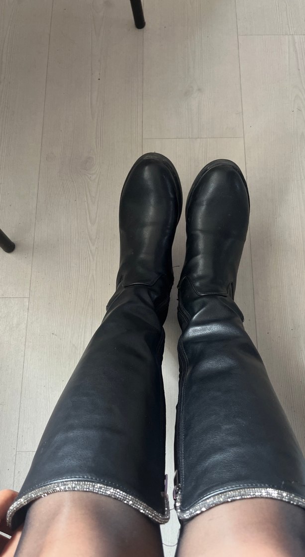 Siyah deri dizüstü botlar, stiletto topuklu ve tokalı detaylıdır. Günlük kullanıma uygun sade ve koyu tasarım. Artık topuklu çizme kullandiğim için satmak istiyorum Kusuru son görselde belirtilmiştir bu yüzden fiyatı uygun tuttumyanında hediye olarak highliter ve bikaç ufak hediye göndereceğim etekler ve taytla çok güzel kombinleniyor PAZARLIK YAPILIR