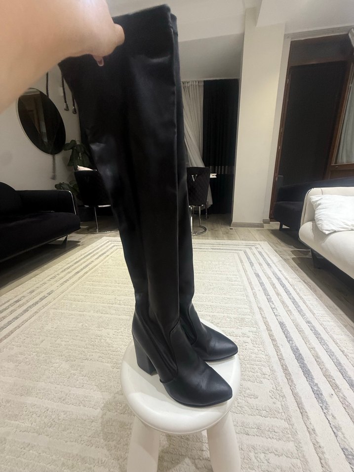 Siyah Deri Dizüstü Topuklu çorap Çizme