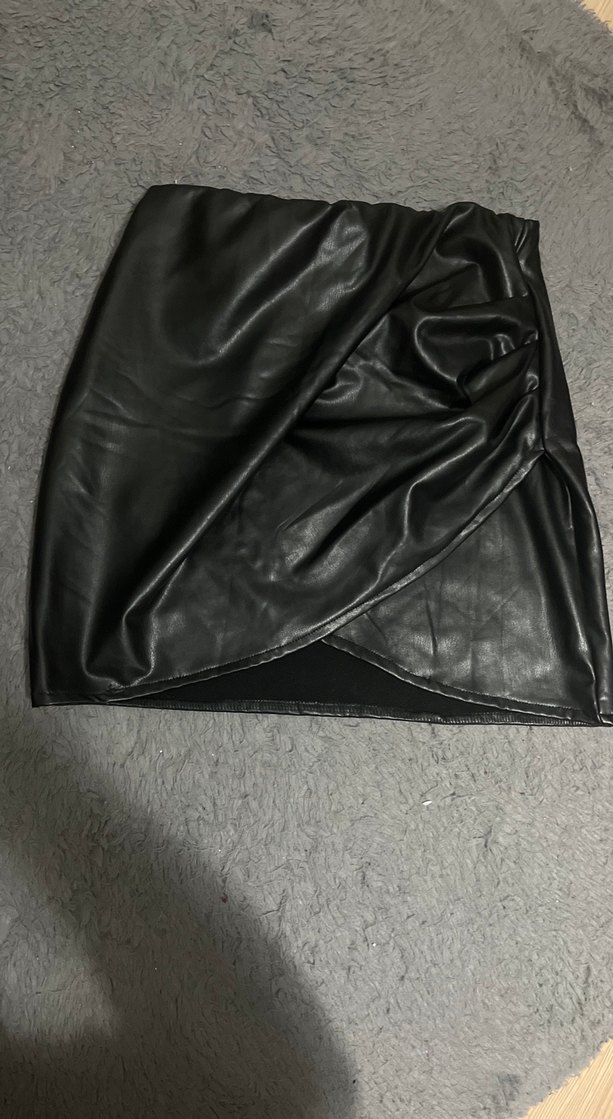 Siyah deri, drapeli tasarıma sahip, midi boyda ve vücuda oturan mini etek. Goth tarzı sokak stiline uygun. Marka temsili