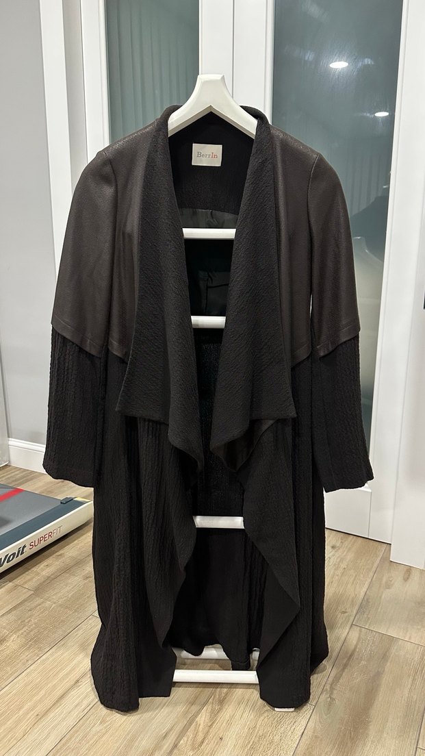 Siyah deri uzun kaban, drapeli ön kısmı ve kesik yaka ile modern Paris tarzını yansıtıyor. Ofis için uygun, rahat kesim ve uzun kolludur.