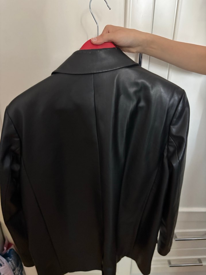 Siyah deri, düğmeli, normal uzunlukta, uzun kollu kadın ceket. Notched lapel yakaya sahip, ofis için uygun.