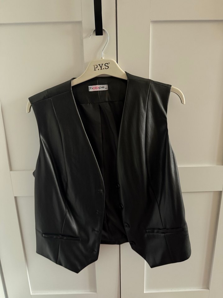 Siyah, kolsuz, V yakalı ve düğmeli deri mini yelek. Şık ve iş ortamına uygun tasarım.