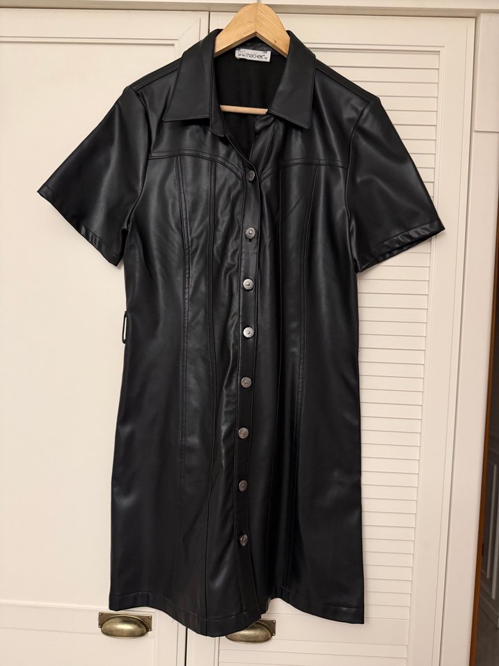Kısa kollu, düğmeli, siyah deri elbise. hiç kullanılmadı. kalıbı dar olduğu için 40a daha uygun olacaktır.