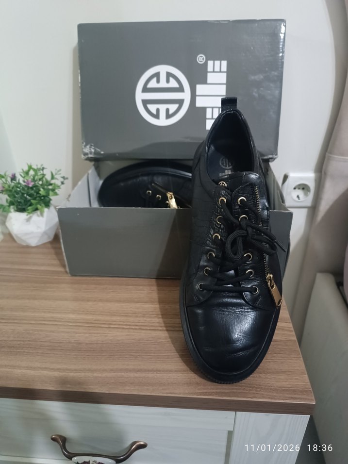 Siyah yüzde yüz deri. özel üretim 44 numara sadece kapalı salonda 1 defa gidilmiştir.