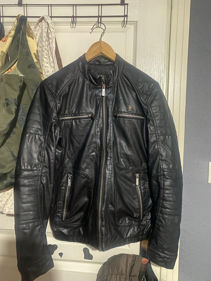 Siyah deri biker ceket, fitted kesim, uzun kollu ve çıtçıtlı yakaya sahip. Tokalı detaylar ve fermuarlı cepler içerir, günlük kullanım için ideal. Kolunda defo mevcut