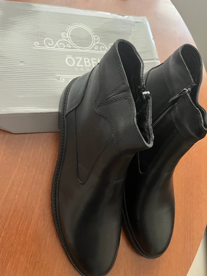 Siyah deri erkek bot, blok topuklu detaylara sahip. Trendy günlük sokak stili için uygundur. Marka: OZBEK hakiki deri