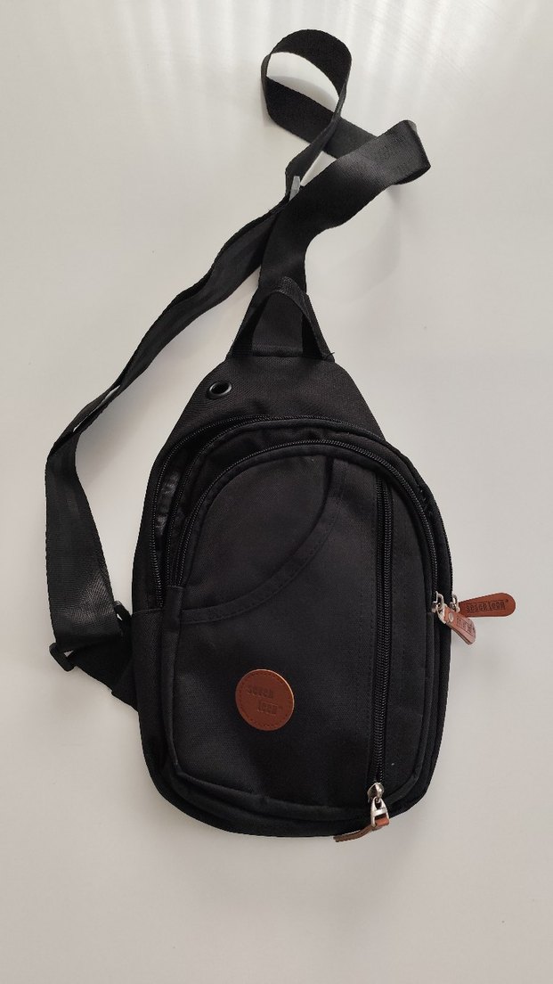 Siyah deri, tokalı kayışlı ve baskılı detaylı çapraz çanta. Trendy günlük sokak stiline uygun, kompakt ve kullanışlıdır.