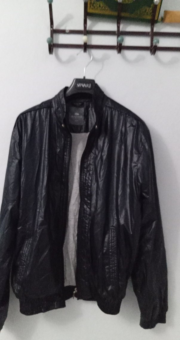 Gri astarlı, fermuarlı, uzun kollu, gevşek kesim siyah deri erkek ceket. Notch yaka detaylı, günlük kullanıma uygun.