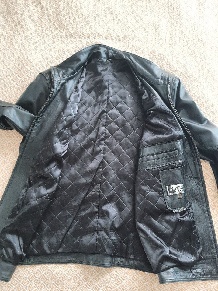 Kuzu derisi yumuşak Siyah deri erkek ceketi, kesik yakalıdır. Normal kesim ve askılı kollara sahiptir, günlük kullanım için uygundur. kullanılmış iyi durumda