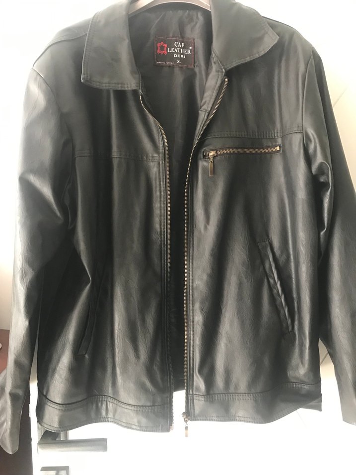 Siyah deri erkek biker ceket, çıtçıtlı yakaya ve fermuarlı ceplere sahiptir. Uzun kollu ve normal kesimdir, ceketin yakasında defo vardır gerçek deri degildir