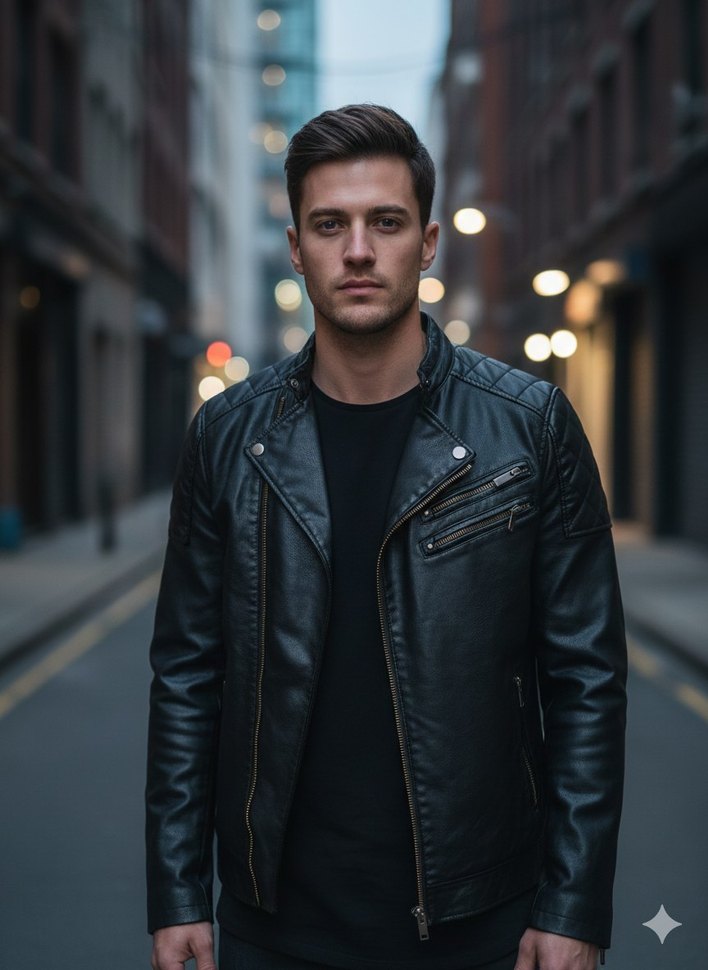 Siyah deri erkek ceket, kesik yaka, düğmeli ön ve uzun kolludur. Regular fit ve midi boyda, rock punk havasıyla sokak stiline uygun.