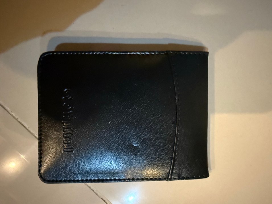 Düz siyah deri erkek cüzdan, hafif kabartmalı marka detayıyla. İş ortamına uygun klasik gotik tarzda. Notluk derıdır