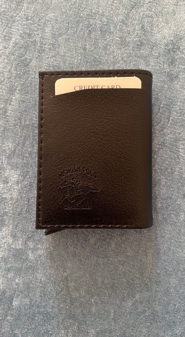 Kahverengi deri erkek cüzdan, baskılı logo ve çoklu kart yuvalarına sahip, klasik iş tarzı için tasarlanmıştır.