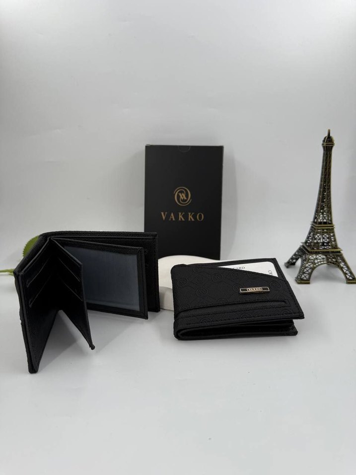 Vakko marka, siyah deri, yapışkanlı kapaklı, modern klasik desenli erkek cüzdanı, günlük kullanıma uygun.