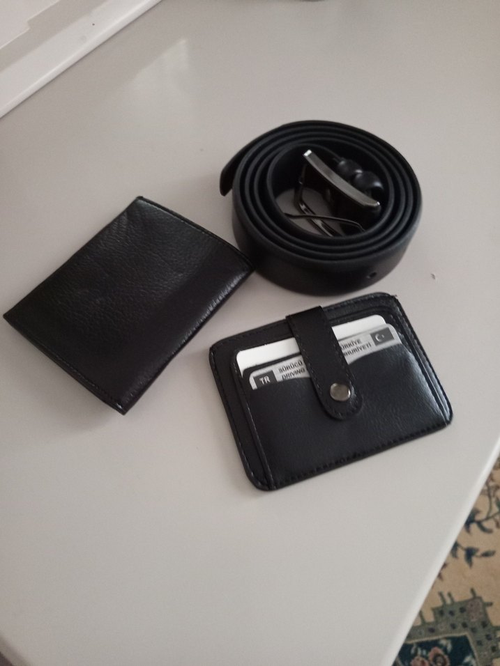 Siyah deri erkek cüzdan ve uyumlu kemer yok Cüzdan, çıtçıtlı kartlık ve sade tasarıma sahiptir. ve düz siyah renktedir.