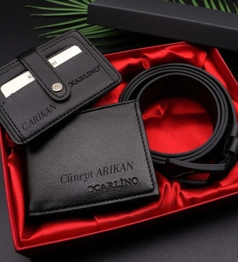 Siyah deri erkek cüzdan ve kemer seti, baskılı marka detayları ve klasik şıklık sunar. İş ortamı için uygun, hafif karşı kültür tarzı ile.